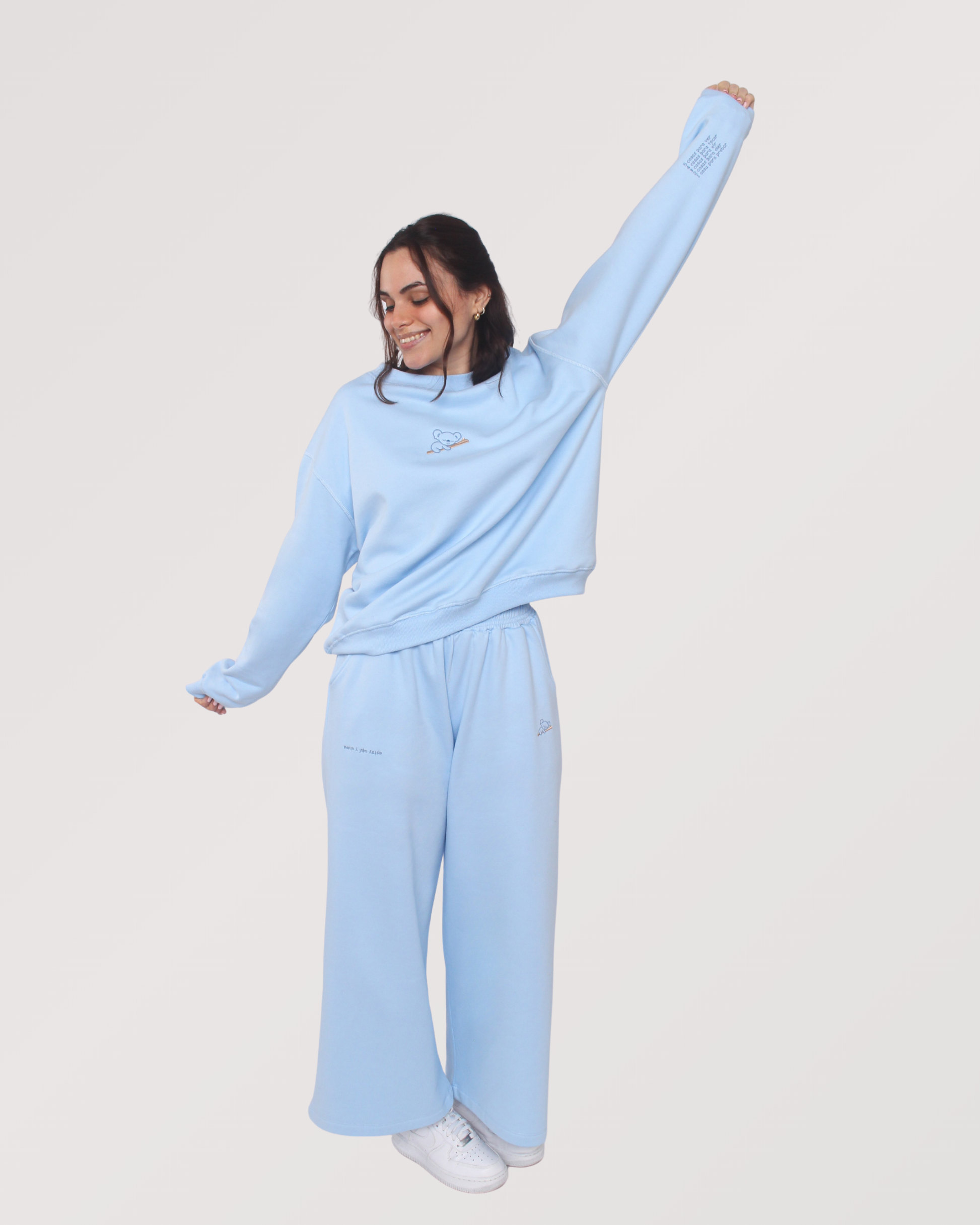 ✨ En el pantalón lleva bordada la afirmación “estoy aquí y ahora”, un recordatorio amable de que el presente es un lugar seguro.
