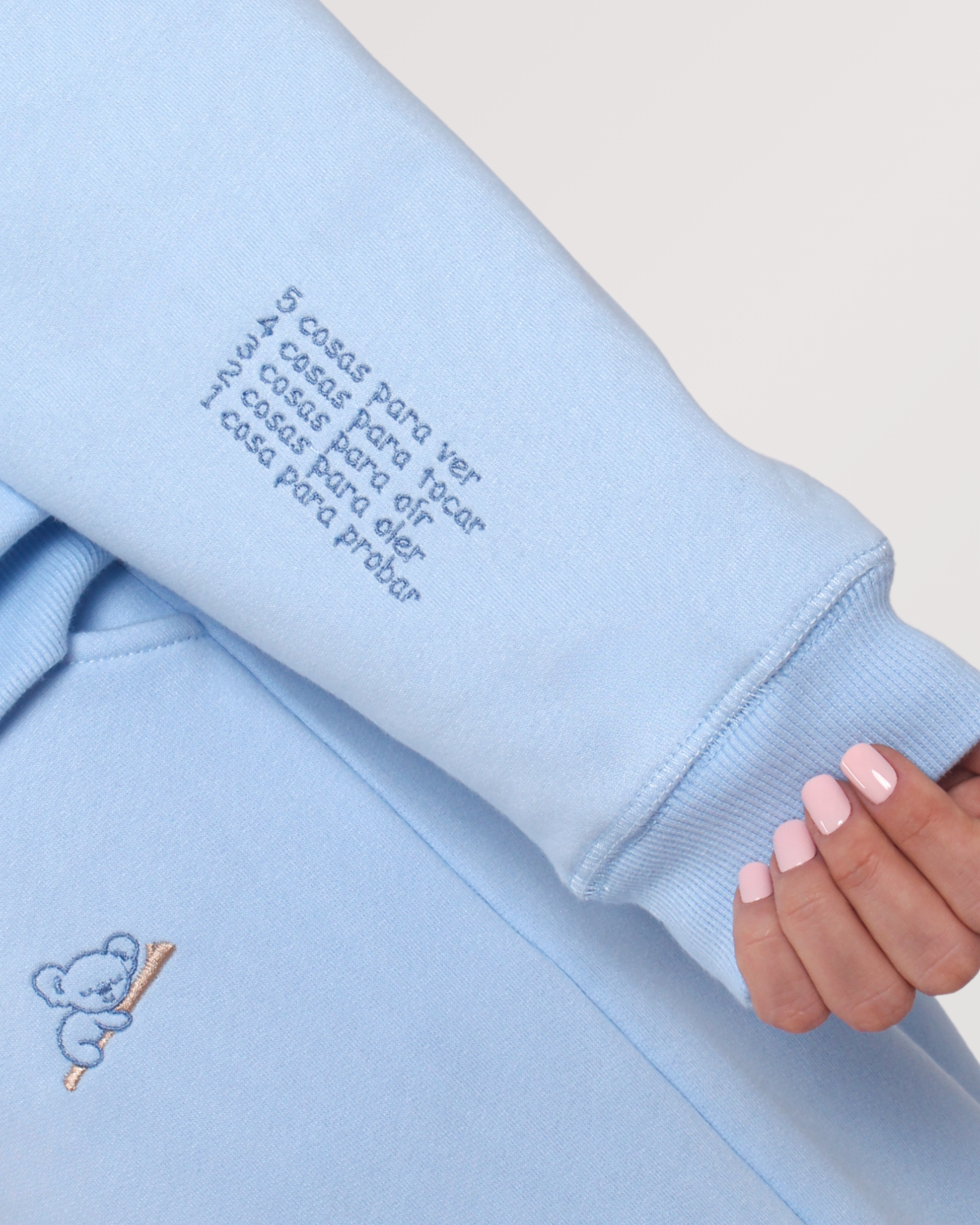 ✨ En la manga lleva bordada la técnica de los 5 sentidos, un ejercicio terapéutico de grounding (anclaje) que ayuda a calmar episodios de ansiedad. Consiste en: observar 5 cosas, tocar 4, oír 3, oler 2 y saborear 1.